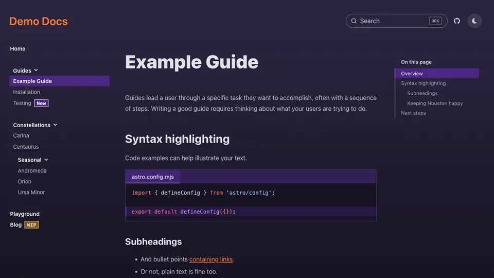 Preview a list of all themes below or try them out interactively on the Starlight Themes demo site.