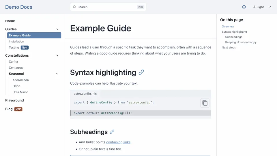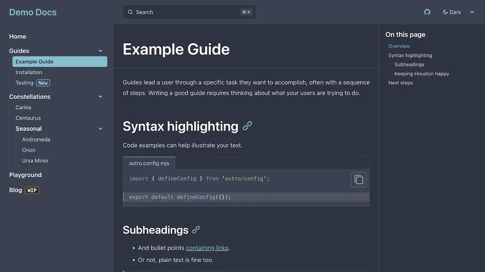 Preview a list of all themes below or try them out interactively on the Starlight Themes demo site.